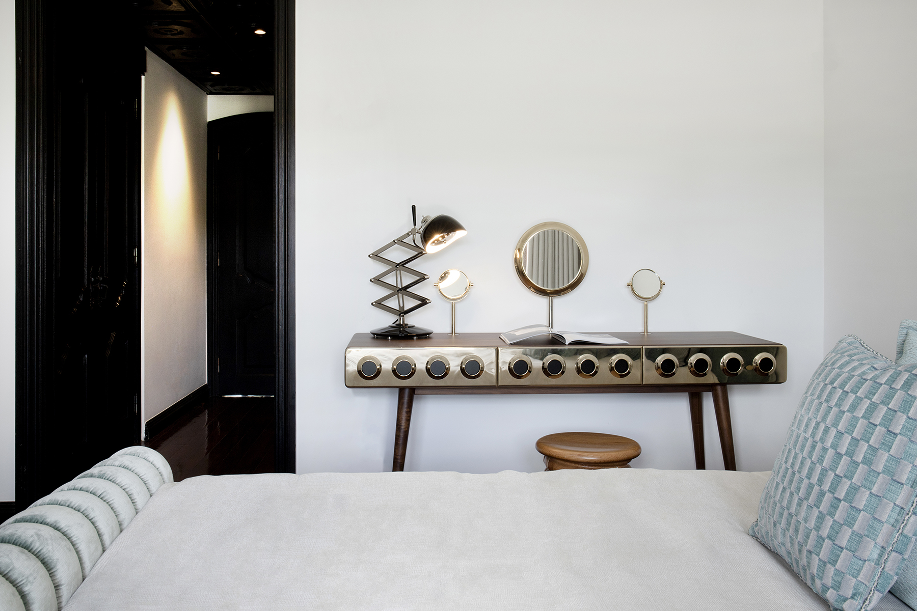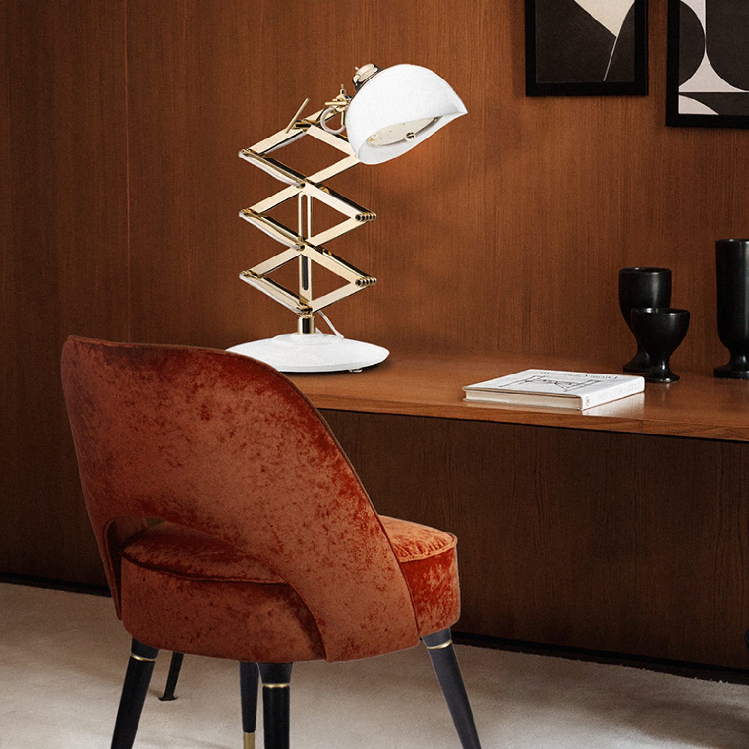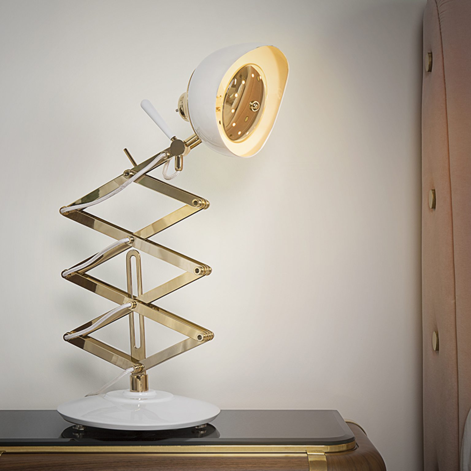 This task lamp is one of DelightFULL’s most versatile pieces. With an extendable arm it can reach almost 24’’, making it the perfect reading lamp, very easy to adjust. Its body and shade are handmade in brass and Aluminium. The black table lamp also features a gold-plated finish and a black textile wire, which can all be customized to fit your decor needs.