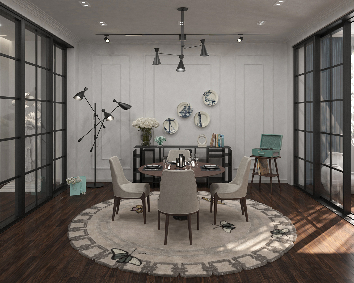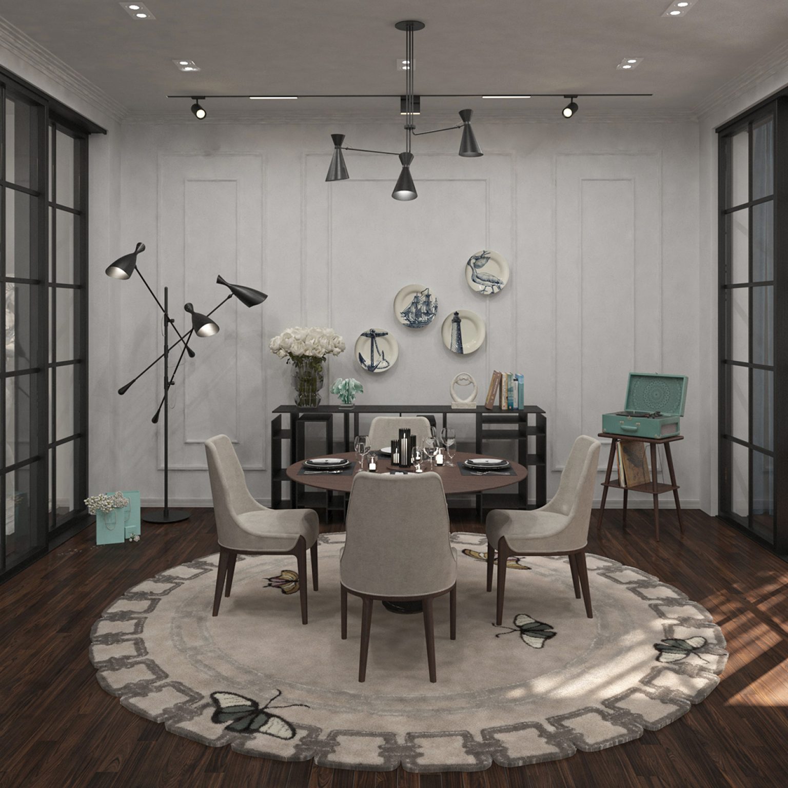 Scofield is an unusual floor lamp with five chrome lights all supported by a white brass base. Each light and bracket rotate separately allowing different light focuses. The mid-century modern floor lamp has round lamp shades in Aluminium, that can support different activities and create an industrial design in the room.