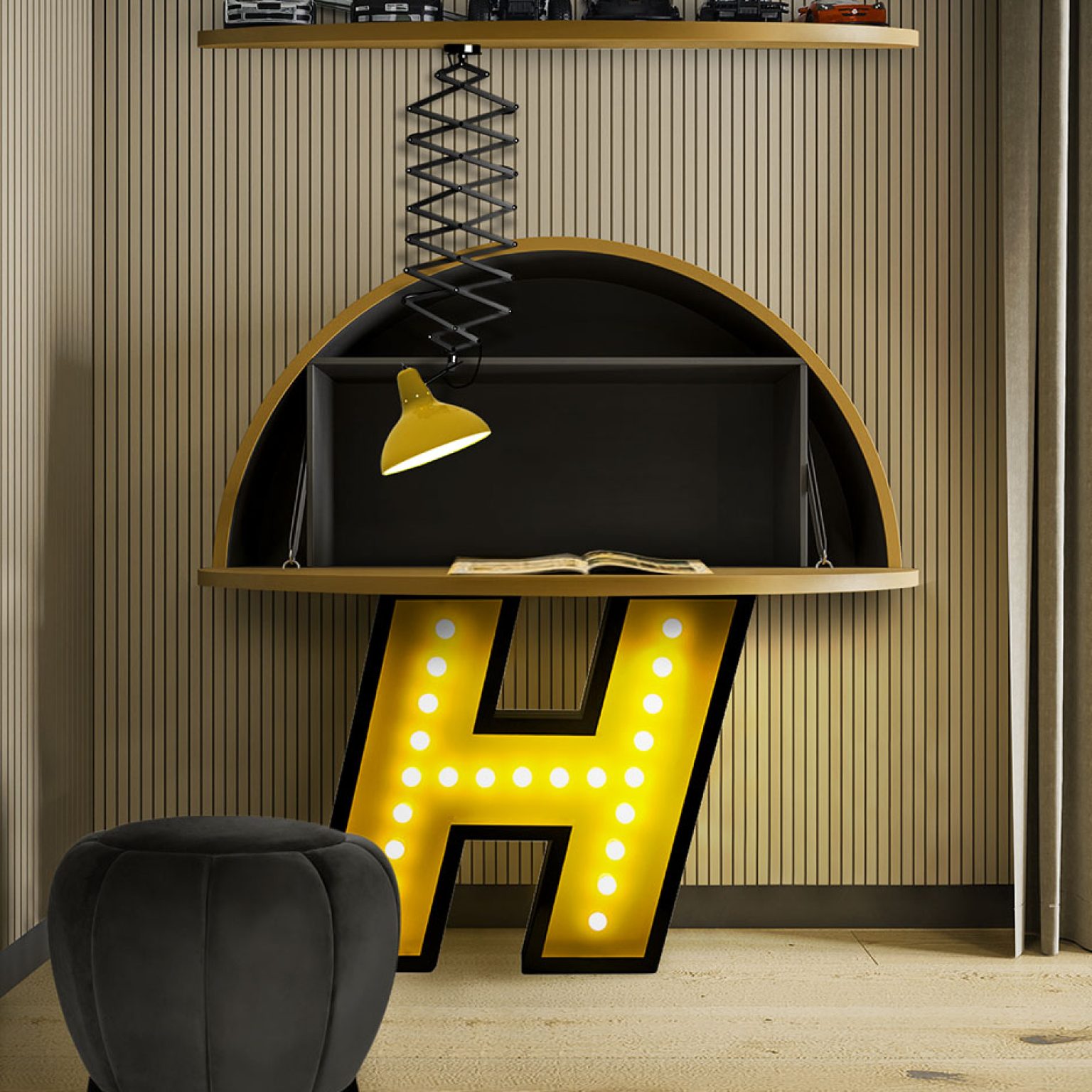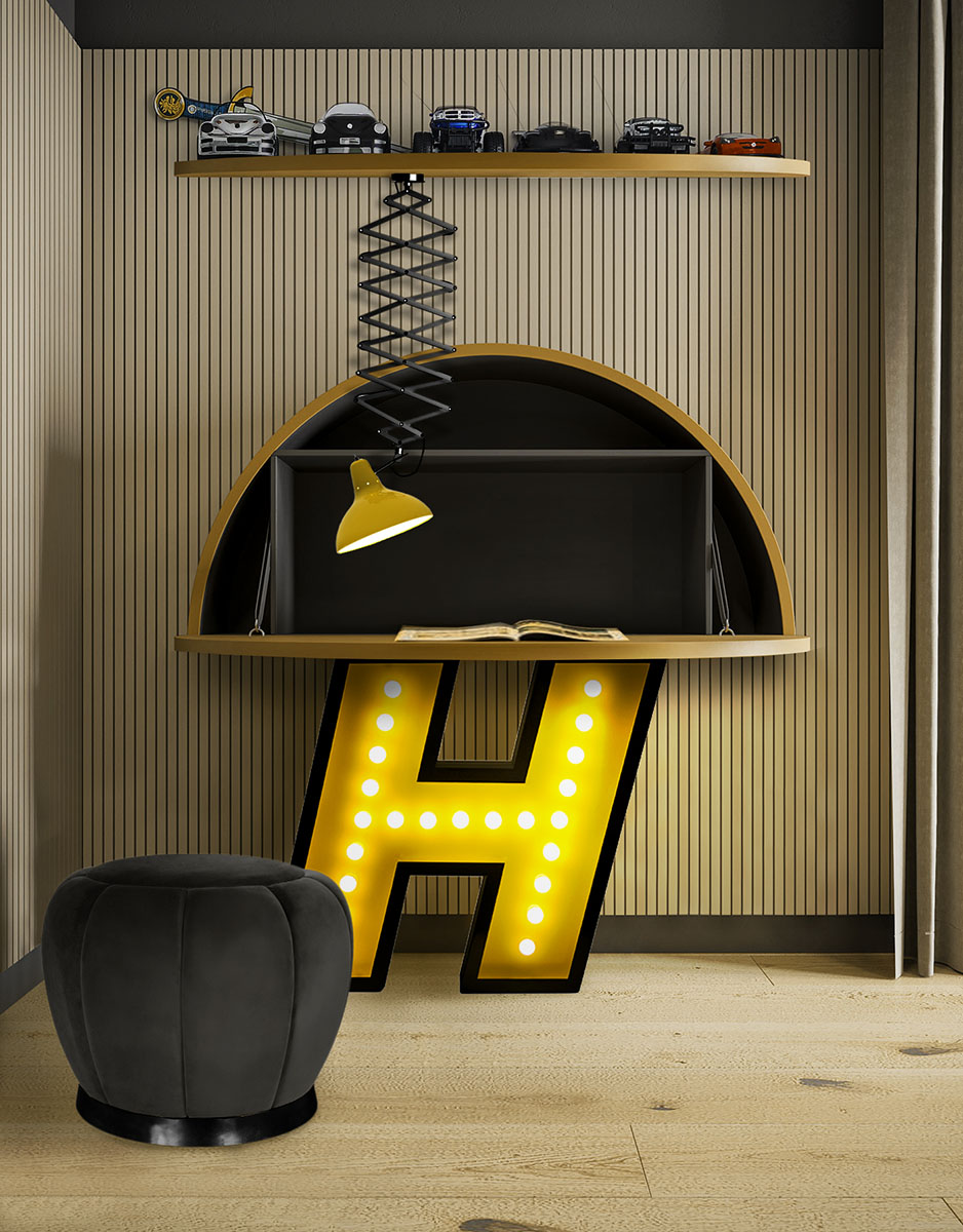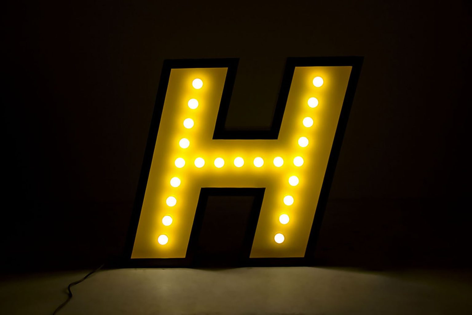 H stands for handmade and for one of the most beloved typefaces hits of this collection. Modern and energetic, this letter draws attention by its standard finishes in italic, with a yellow color and black outline. Made of shiny stainless steel and shining with 17 bulbs, this marquee letter design is available for colour customization and in a mini version! And its also able to put into your floor or your sleek wall. Made only for your interiors.