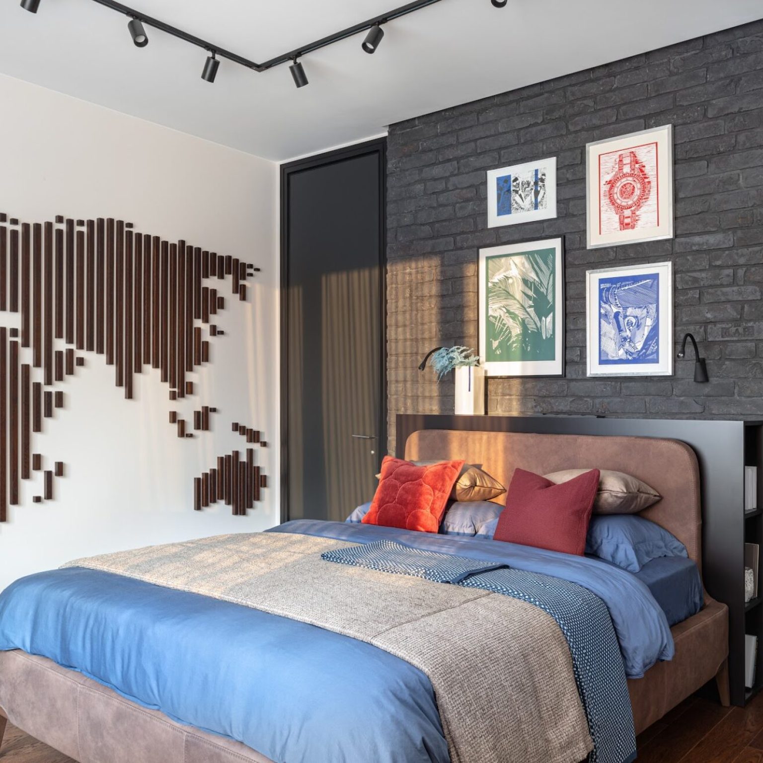 This two-room apartment is located in a quiet and peaceful area of Moscow. Its lucky owner is a young student who plays the guitar and is passionate about music. E.L.F. INTERIOR design studio, relied on Elena Gladkova (interior designer) and Anton Likhtarovich (photographer) to conceive this project, Polina Rozhkova and Yana Yahina (interior photo stylists).